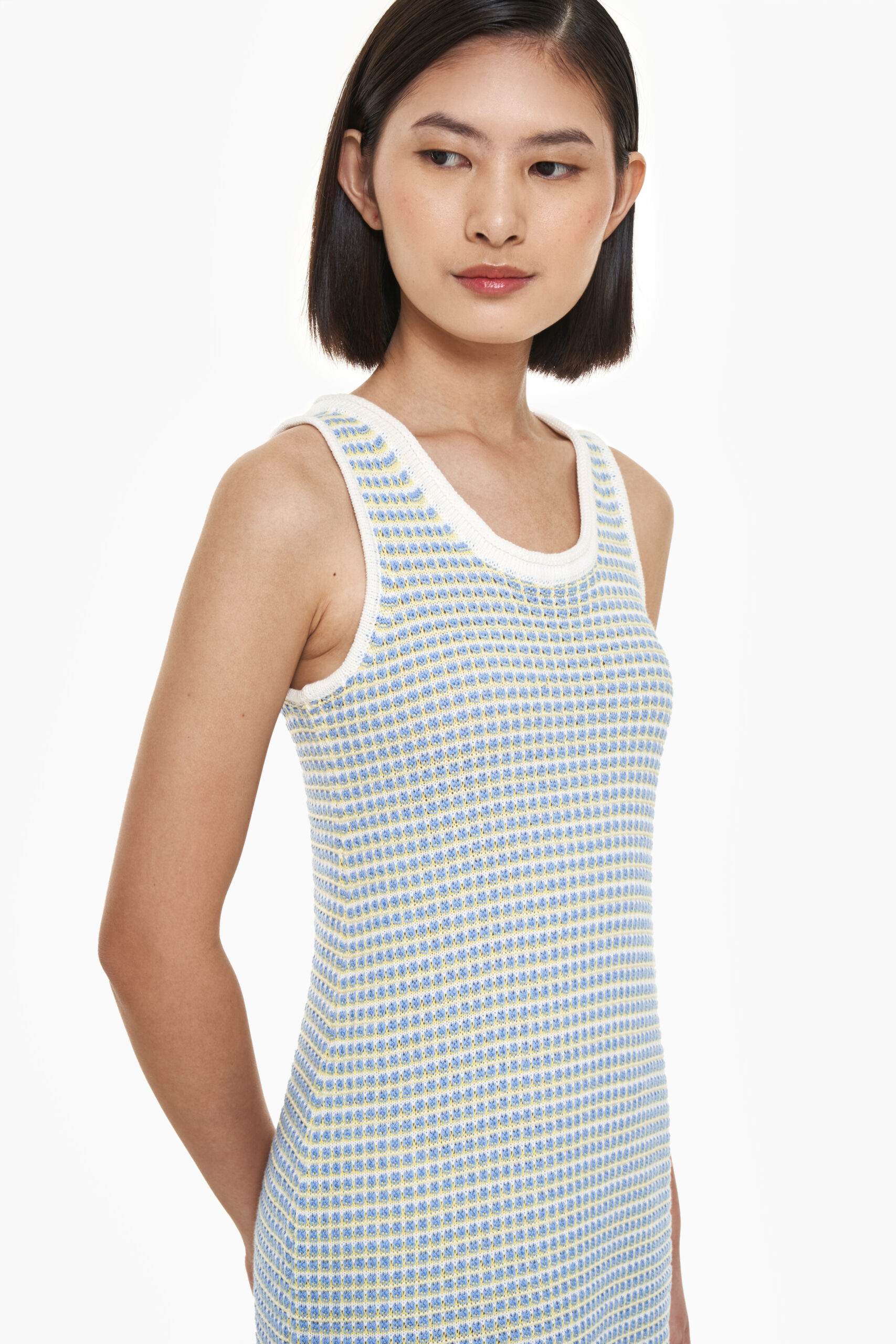 Luncheon attire appropriate. This is a fully knitted midi dress with a side slit. It’s crafted with midweight, all-season cotton yarn that’s soft to the touch.