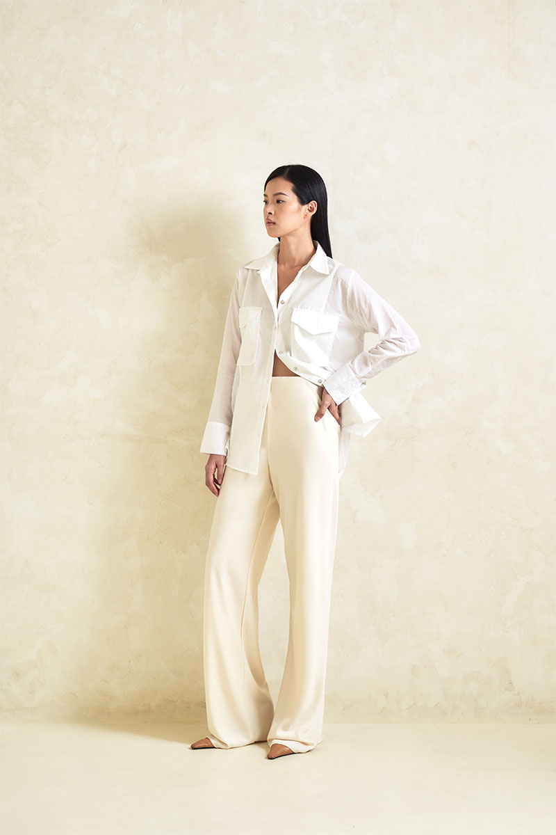 Hamptons-level lounge. These are relaxed high-rise pants with an elastic waistband and a bias cut leg. They’re cut from drapey satin fabric with a smooth feel and soft sheen. You truly must have one.