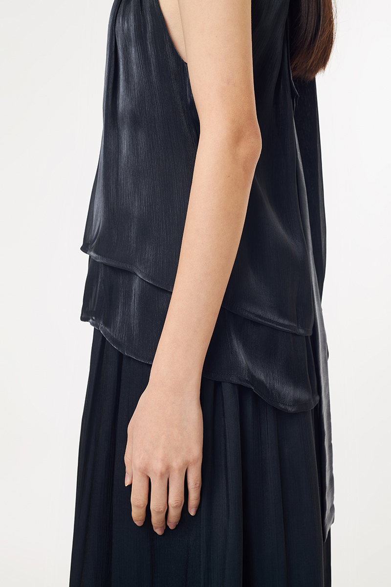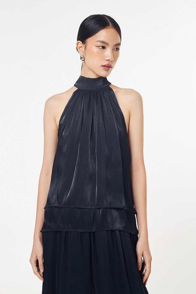 The genre is romance. This is the ultimate festive halter blouse. It’s made with shimmery, drapey chiffon fabric with a smooth look and lightweight feel. Don’t forget to do an up-do hairstyle if you’re looking for that big bow on the back.