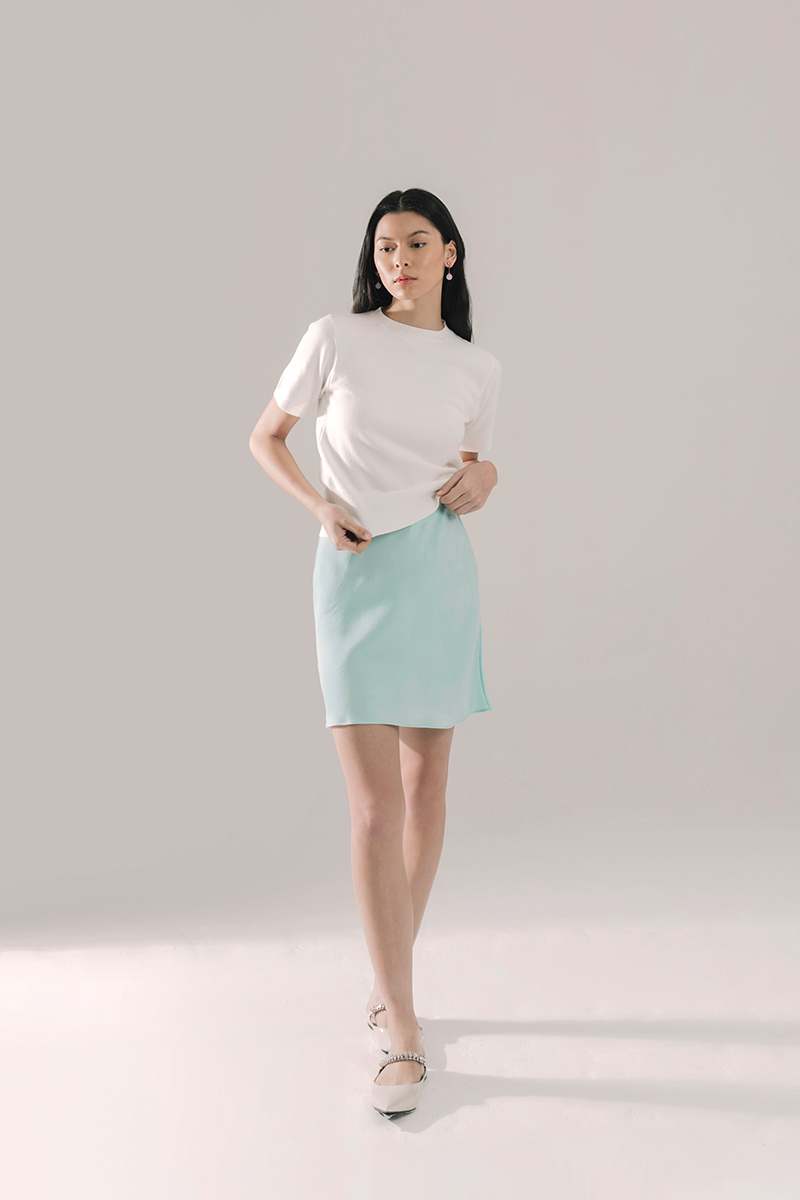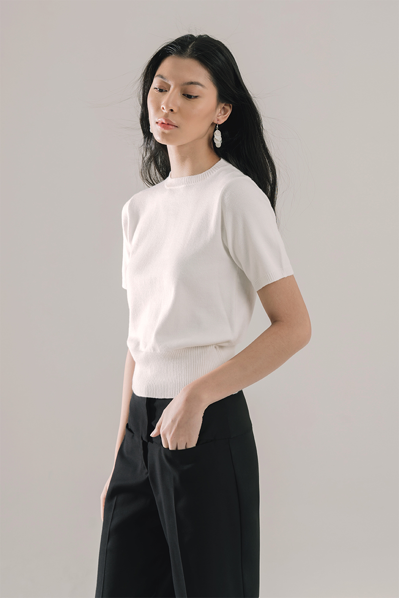 Knitted from soft viscose yarn, this lightweight knitted tee features a classic round collar with a regular fit bodice. It has a seamless construction and wide ribbed hem that’s perfect for tucking into high-waisted bottoms.
