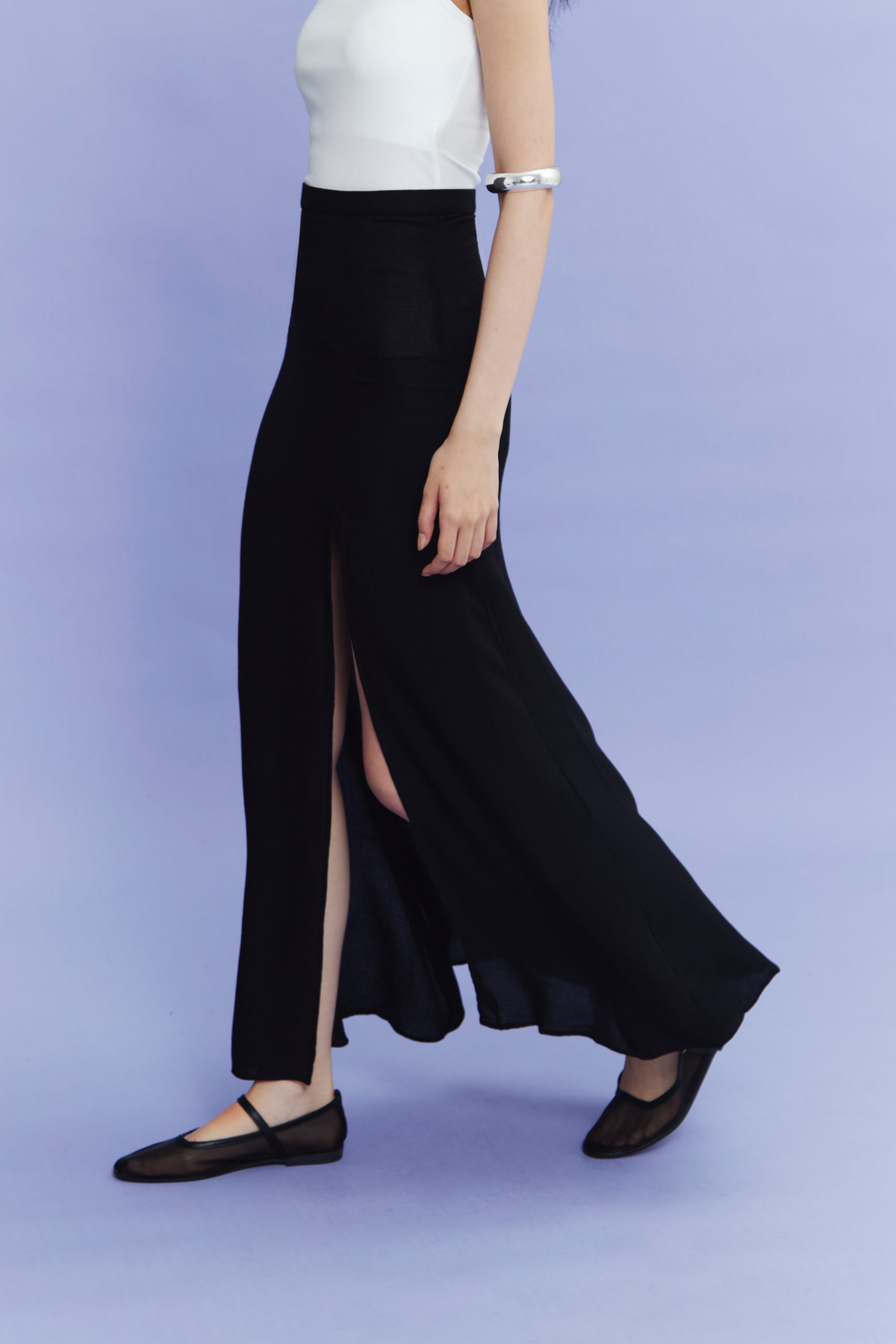 Slip into a slit skirt. This is high-rise maxi slit skirt made with breeze, subtle texture fabric that is perfect for the spring and summer time.